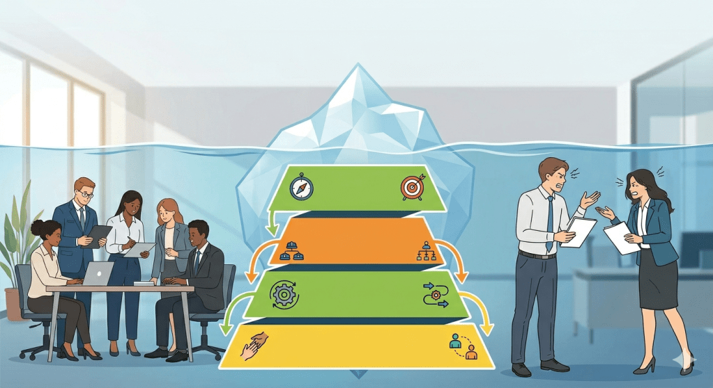 Disfungsi tim seringkali dianggap disebabkan oleh rusaknya hubungan interpersonal (seperti yang terjadi pada kasus yang saya alami). Pada kenyataannya, isu interpersonal sering kali hanyalah puncak dari sebuah gunung es. Gesekan antar individu kerap menjadi “kambing hitam” yang paling mudah disalahkan, padahal akar masalahnya justru bersembunyi pada elemen-elemen fundamental di atasnya. Di sinilah Model GRPI hadir sebagai kacamata diagnosis yang dapat membantu setiap anggota tim berpikir lebih jernih.